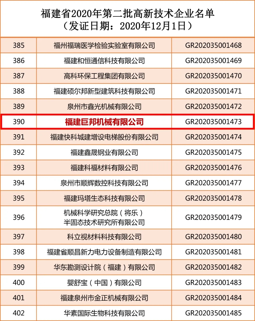 巨邦機械上榜福建省2020年第二批高新技術(shù)企業(yè)名單 |