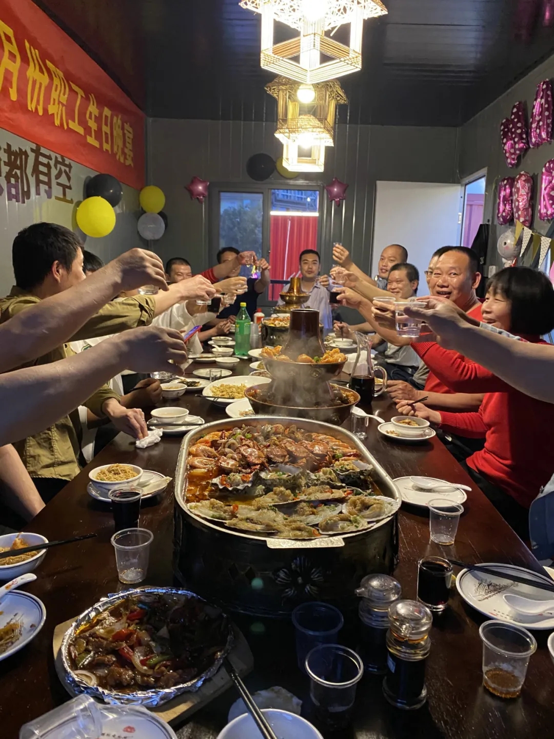晚會(huì)開始前,行政人事部已將現(xiàn)場布置得溫馨浪漫,繽紛多彩的氣球和生日橫幅等裝飾掛起,生日蛋糕、各種水果、美酒佳肴琳瑯滿目。大家舉杯慶賀,親切交談,壽星們在集體的祝福下露出幸福的笑容,大家共同分享公司的豐盛成果,沉浸在一片歡樂喜悅之中。